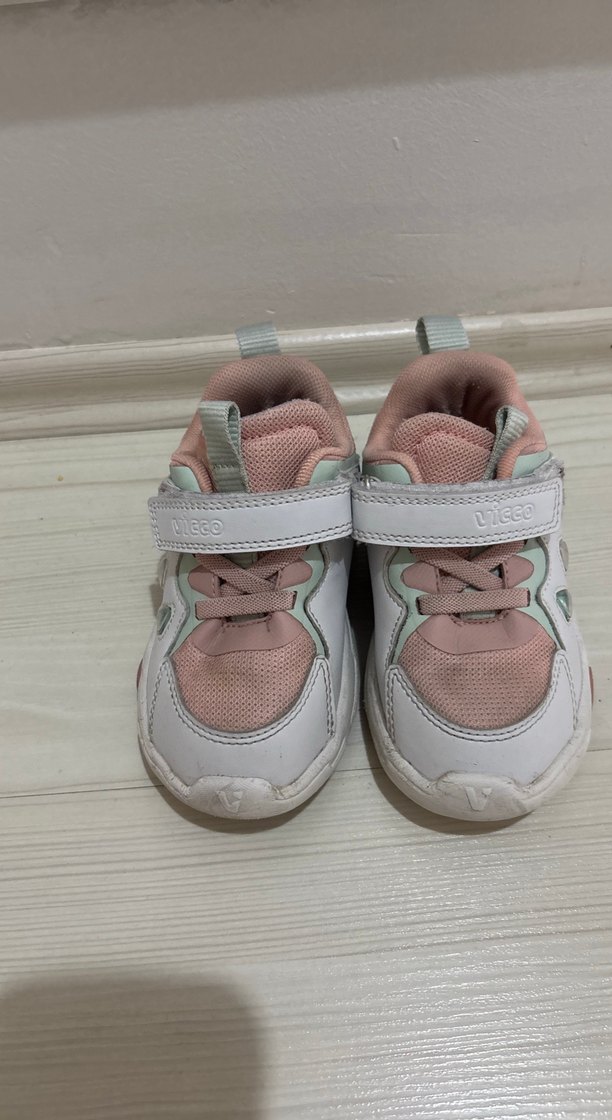 Cırtcırtlı bantlı, pastel pembe kız çocuk spor ayakkabısı. Lastik tabanlı ve sade desensiz, günlük sokak stili için uygun.