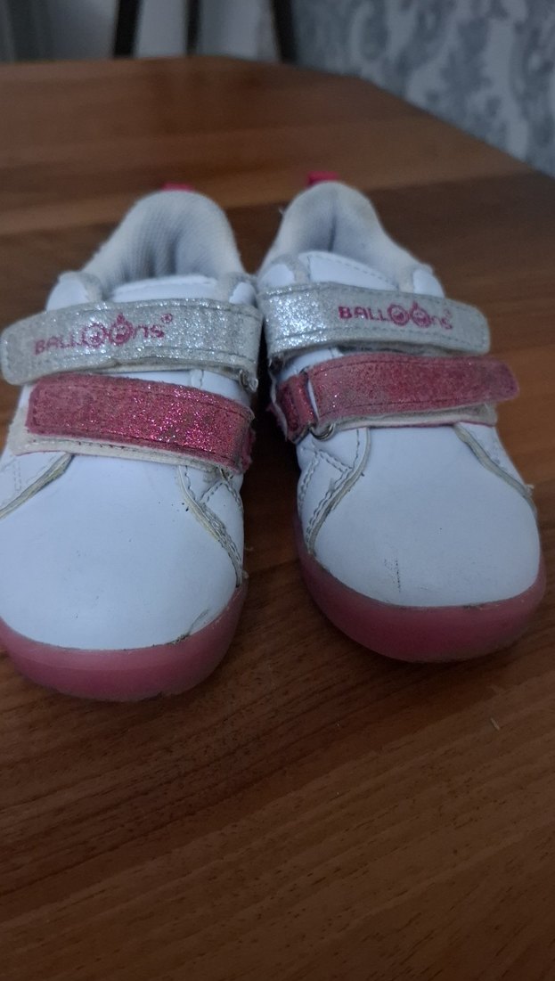 Kız çocukları için renkli pembe baskılı cırt cırtlı bantlara, kauçuk tabana ve trend sokak modasına uygun tarzda spor ayakkabılar. Flo ici biraz kirli