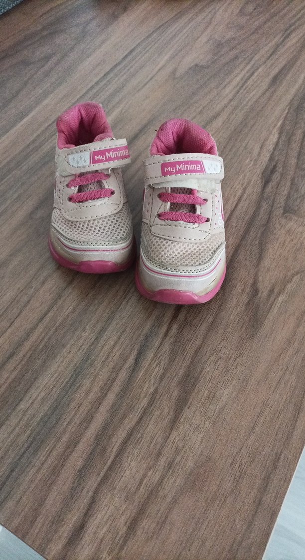 Bu kız çocuk spor ayakkabıları, pastel pembe ve bej renklerde, cırtlı kapama ve kauçuk tabanlıdır. Düz ve normcore tarzındadır, "My Minima" etiketlidir.