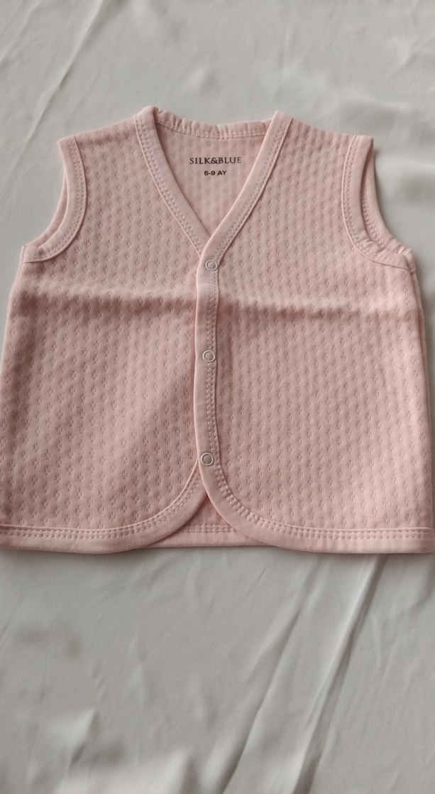 Pembe pastel renkte,Çıtçıtlı V yakalı kız çocuk yeleği. Kolsuz, ve yumuşak %100 pamuklu kumaştan yapılmıştır. Düz ve sade tasarıma sahiptir.