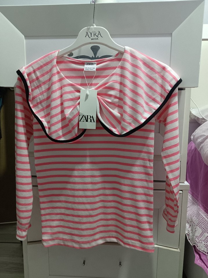 ZARA'dan yumuşak ve sıcak kumaştan, uzun kollu, yuvarlak yakalı, pembe pastel çizgili ve fırfırlı yakalı bol kesim kız çocuk sweatshirt.
