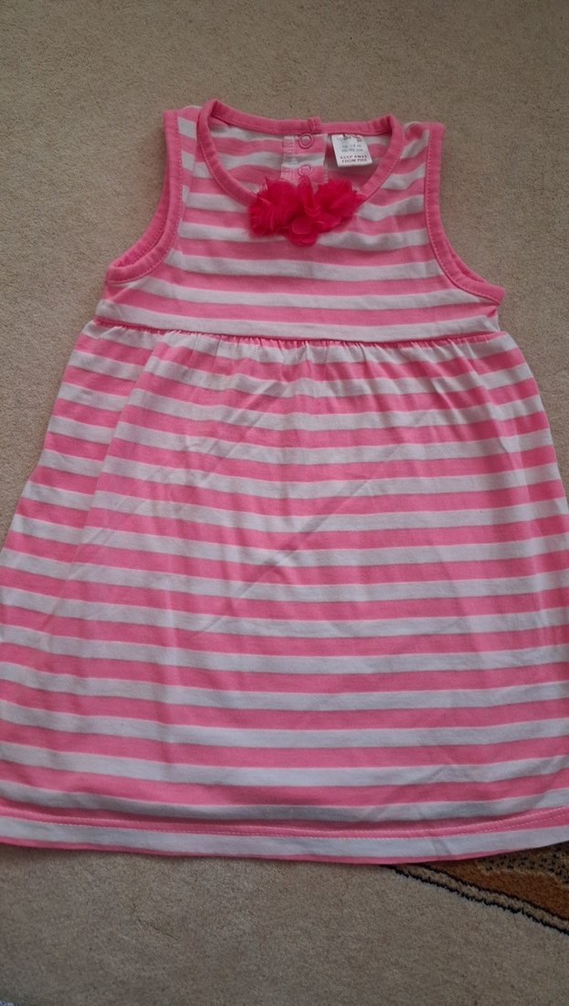 Renkli, kolsuz bu elbise pembe ve beyaz çizgilerle, straplez yakalı ve fırfırlı detaylıdır. Yumuşak sentetik kumaştan yapılmıştır, rahat bir kullanım sağlar.