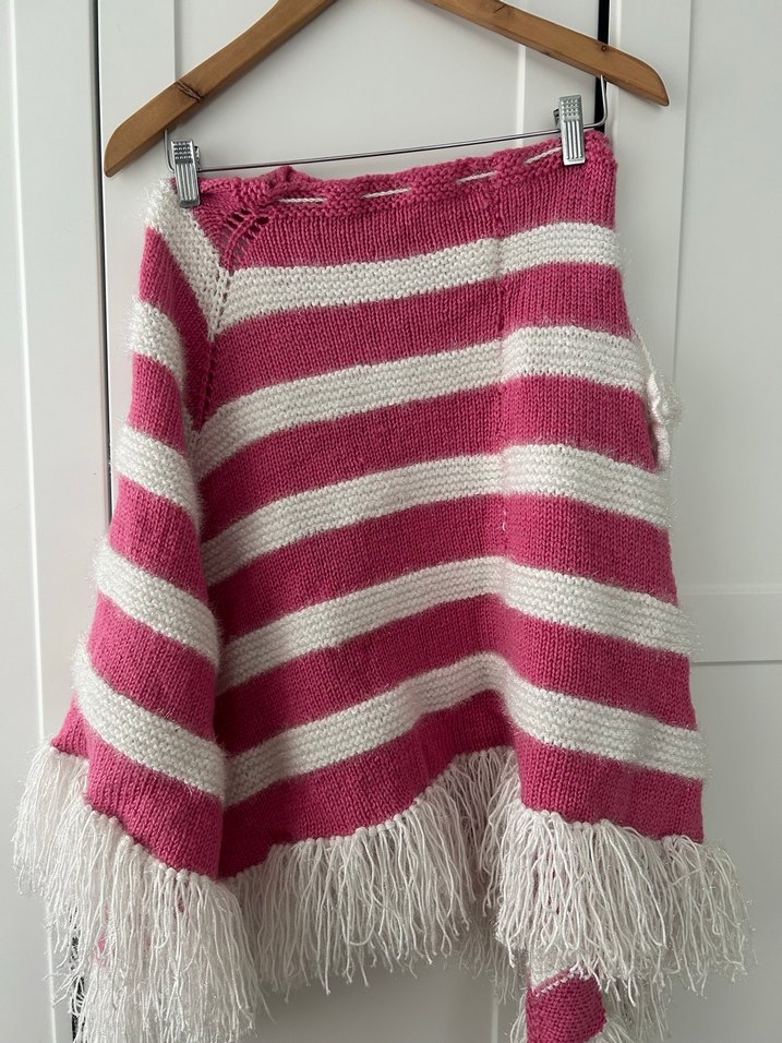 Pembe ve beyaz çizgili, örgü kumaştan bol kesim kız çocuk panço. Alt kısmında püskül detaylarıyla bohem tarzda. El yapımıdır