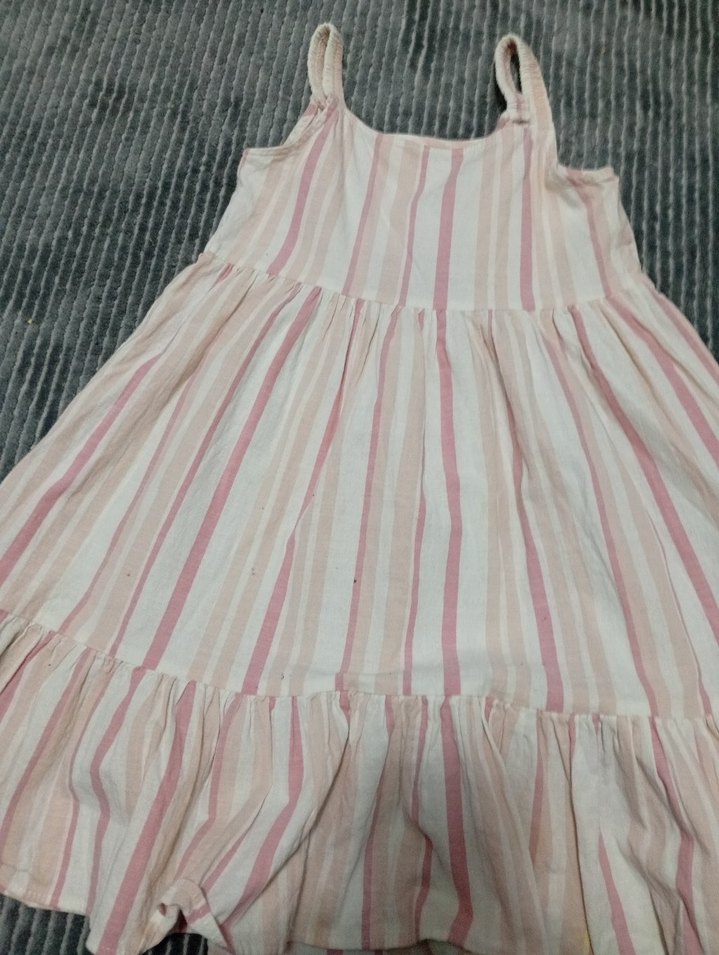 Pembe pastel çizgili, pilili ve askılı, straplez yakalı, bol kesim kız çocuk elbisesi. Yumuşak sentetik kumaştan, bohem tarzında.