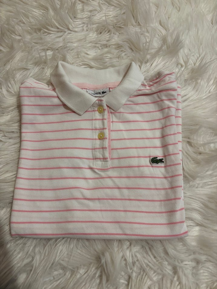 orjınal sorunsuz 12 yaş kısa kollu, yakalı ve düğmeli, pembe çizgili polo tişörtü.