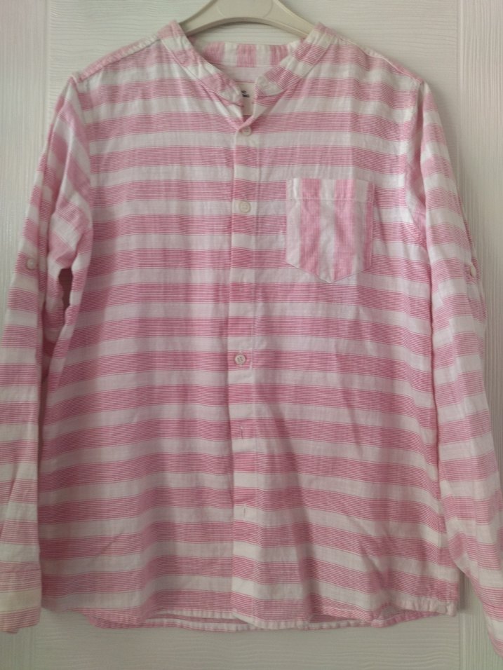 Erkek çocuk için pamuklu, uzun kollu, düğmeli ve yakalı gömlek. Gevşek kesimi ve pastel pembe-beyaz çizgili deseni ile rahat bir kullanım sunar. kolu biraz sararmış ama çok belli olmuyor