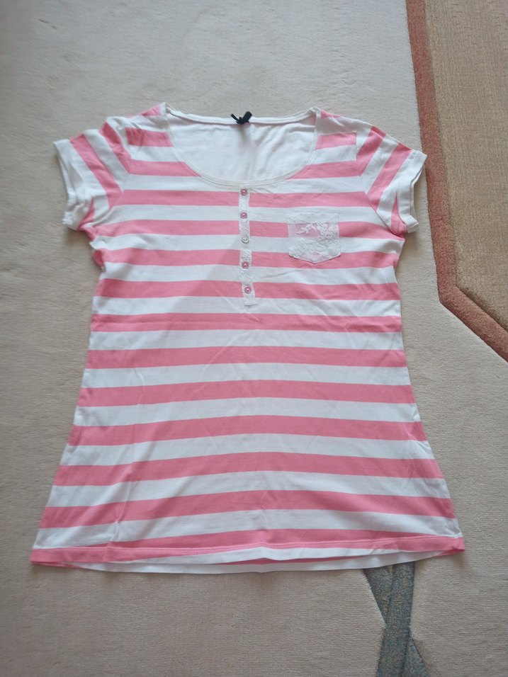 Pamuklu, kısa kollu, bol kesim kız çocuk tişörtü. Pastel pembe-beyaz çizgili, V yakalı ve düğmeli, rahat sokak stili için uygun.