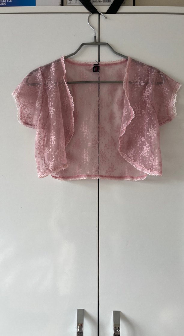 Fitted kesim kız çocuk bolero, pastel pembe dantel ve nakış detaylıdır. Kısa kollu ve straplez yakalı, bohem tarzı için uygundur.