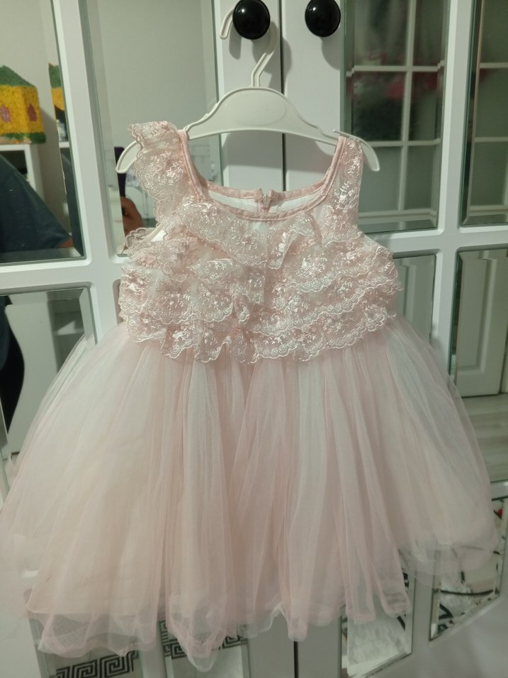 Kız çocukları için uyumlu, dantel işlemeli detaylara sahip straplez, pembe pastel tonlarda sentetik kumaştan modern klasik elbise.
