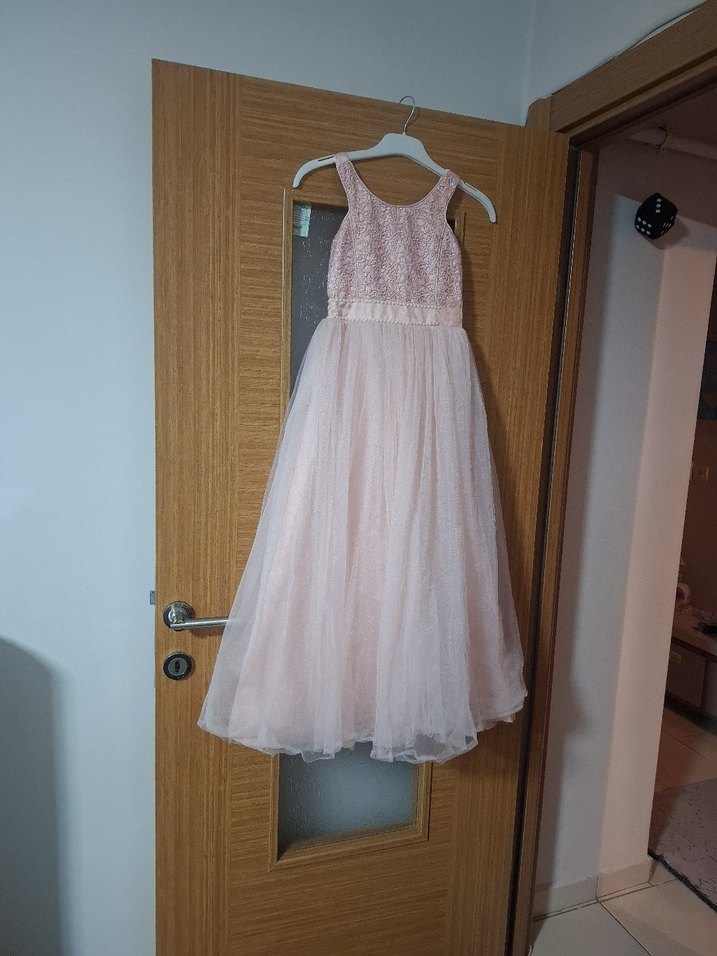 Dantel detaylı, askısız ve kolsuz pembe elbise. Yumuşak sentetik kumaştan, klasik bohem tarzda ve pastel tonlarda, desen içermeyen şık bir model.
