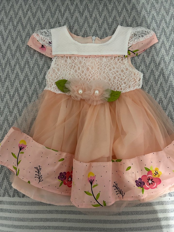 Kısa kollu, dantel detaylı ve çiçek desenli, pastel pembe renkte bohem tarzda kız çocuk elbisesi.Yuvarlak yakaya sahiptir.