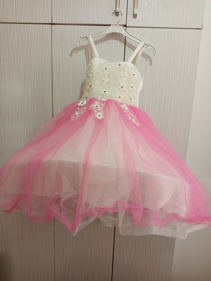 Kız çocuk elbisesi, kolsuz tasarıma sahiptir. Sentetik kumaştan yapılmış, işlemeli dantel detayları ve açık pembe katmanlı etek ile bohem tarzındadır.Tülünde ufak tefek kusurlar var, fazla belli olmuyor.
