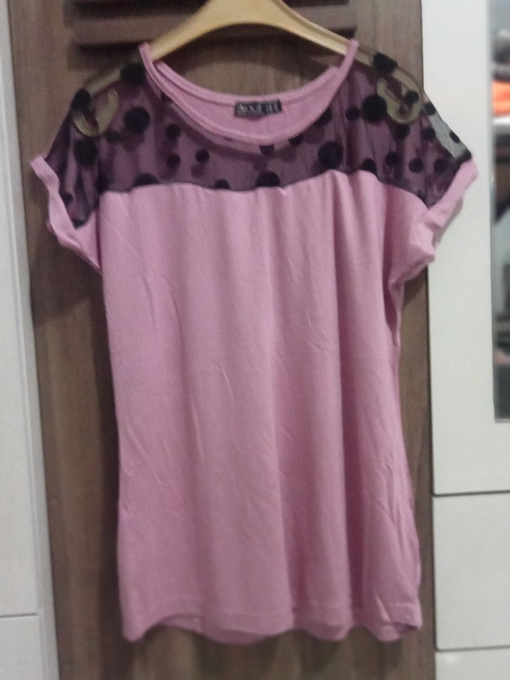 Pembe kısa kollu kız çocuk tişörtü, bol kesim ve yuvarlak yakaya sahiptir. Üst kısmı dantel detaylı ve desenlidir, sokak tarzına uygundur. Yumuşak sentetik kumaştan üretilmiştir.