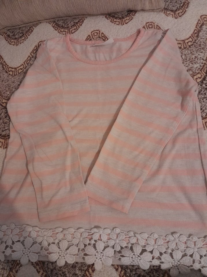 Uzun kollu, yuvarlak yakalı kız çocuk triko bluz, yumuşak kumaştan üretilmiş. Pembe pastel renkte, dantel detaylı, bol kesimdir.