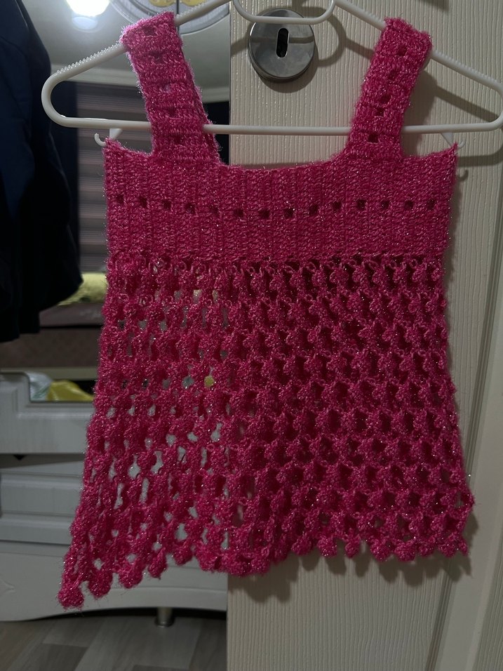 Kız çocukları için pembe renkli, dantel detaylı örgü askılı bluz. Kolsuz ve straplez kesim, bol ve bohem tarzda tasarlanmıştır. 1-2 yaş uyumlu sorunsuz