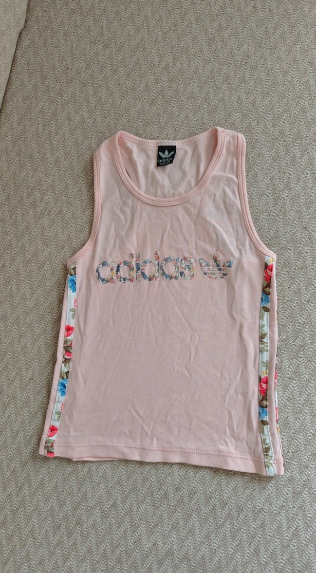 Pembe renkli, kolsuz ve straplez kesim Adidas kız çocuk atleti, çiçek desenli logo ve yanlarda dantel detaylarıyla şık bir sokak stili sunar.