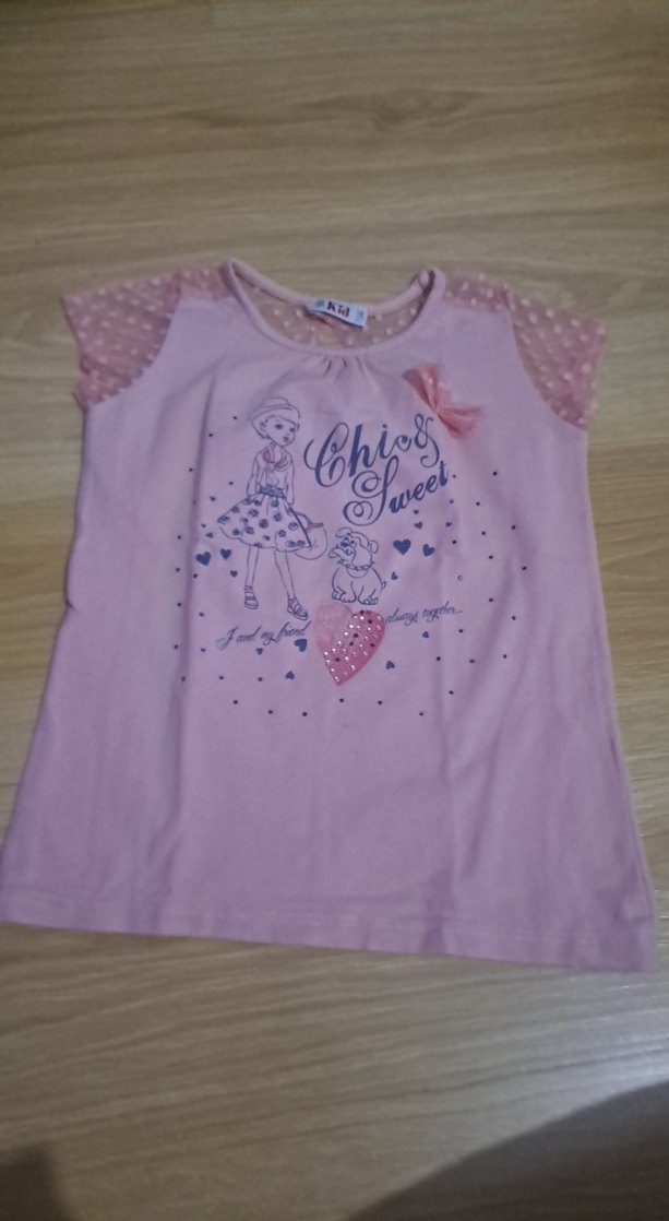 Pamuklu, kısa kollu, dantelli omuz detaylı, pastel pembe renkli, baskılı ve bol kesim kız çocuk tişörtü.