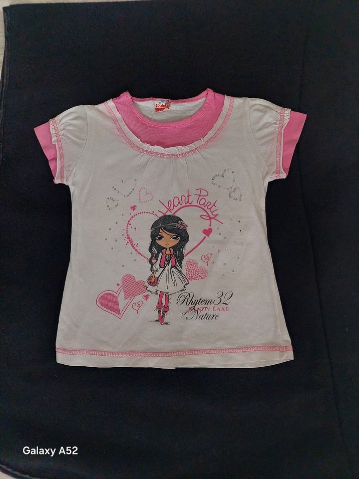 Pamuklu, kısa kollu, bisiklet yakalı, dantelli detaylara sahip, baskılı renkli kız çocuk tişörtü. Trendy ve rahat bir tasarım sunar.