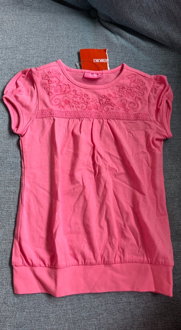 Kısa kollu, yuvarlak yakalı pembe kız çocuk tişörtü, nakış ve dantel detayları ile, yumuşak pamuklu kumaştan üretilmiştir.