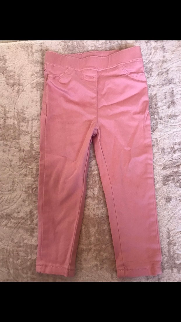 Kız çocukları için dar kesim, elastik bel bandına sahip pembe pantolon, yumuşak sentetik kumaştan üretilmiştir.