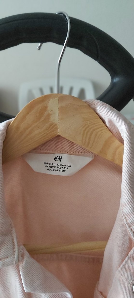 Kız çocukları için pastel pembe renkte, düğmeli, notched lapel yakalı, bol kesim denim ceket. Desensiz, sokak stili için uygun.