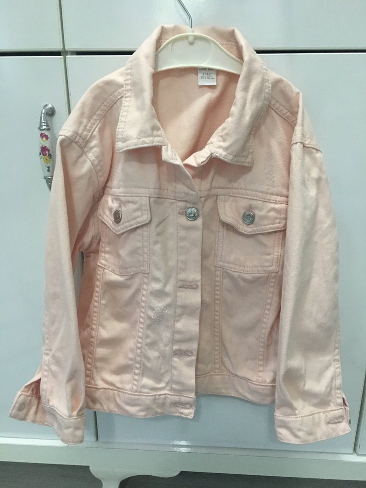 Pembe pastel tonlarda, düğmeli ve kesik yakalı kız çocuk denim ceketi, bol kesimiyle sokak modasına uygun.