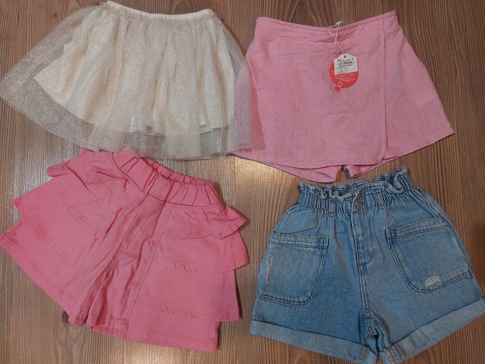 Kız çocuklar için pembe renkte, volan detaylı ve rahat lastikli bel bandına sahip bol kesim denim şortlar.