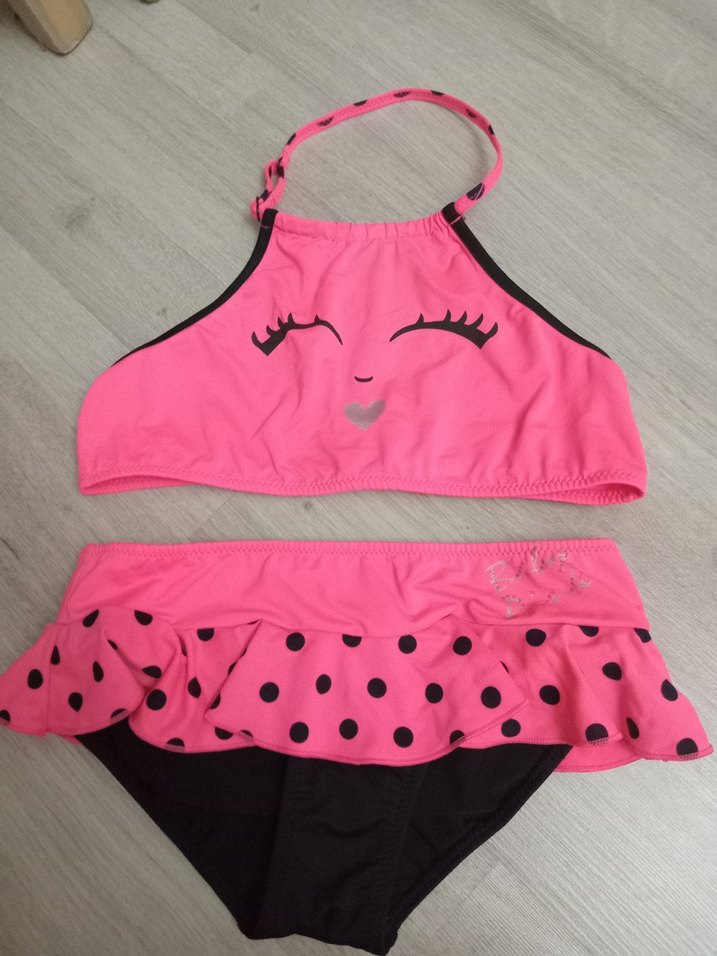 Pembe renkli, askılı üst kısmında yüz baskısı olan, alt kısmında puantiyeli fırfırlı etek detaylı kız çocuk bikini. 7/8yaş
