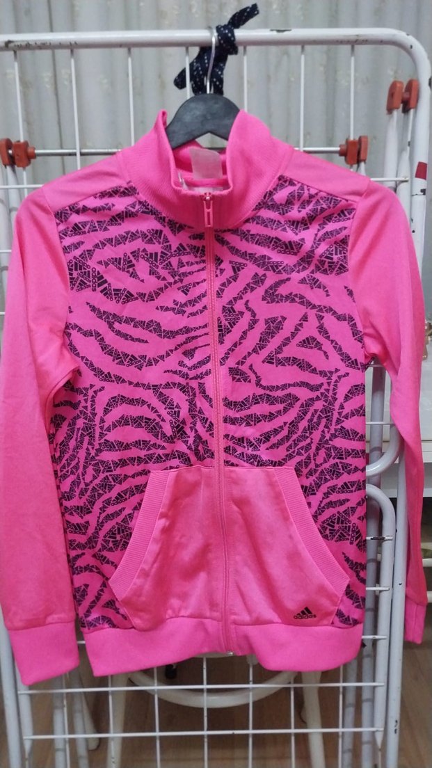 Pembe renkli, fermuarlı ve yüksek yakalı kız çocuk ceketi. Canlı desenli sentetik kumaştan, trend sokak stili için uygundur.