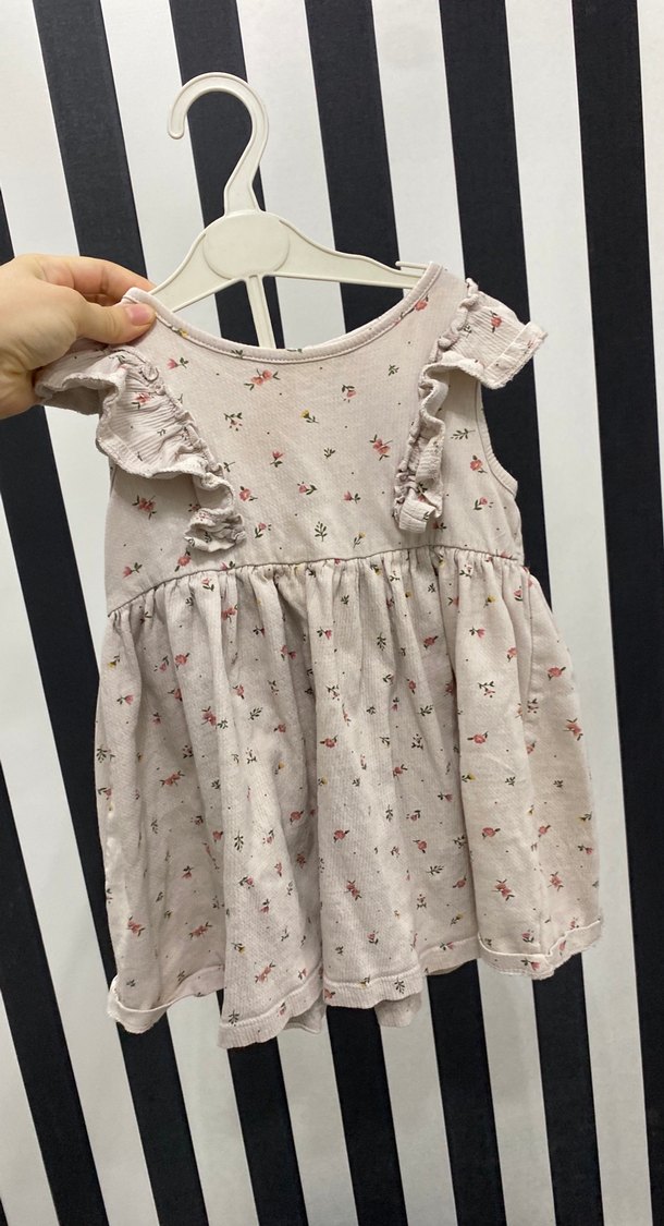 Kolsuz, straplez yaka ve fırfır detaylı kız çocuk elbisesi. Yumuşak tekstil kumaştan, gri zemin üzerine pembe desenli, bol kesim ve bohem tarzda.
