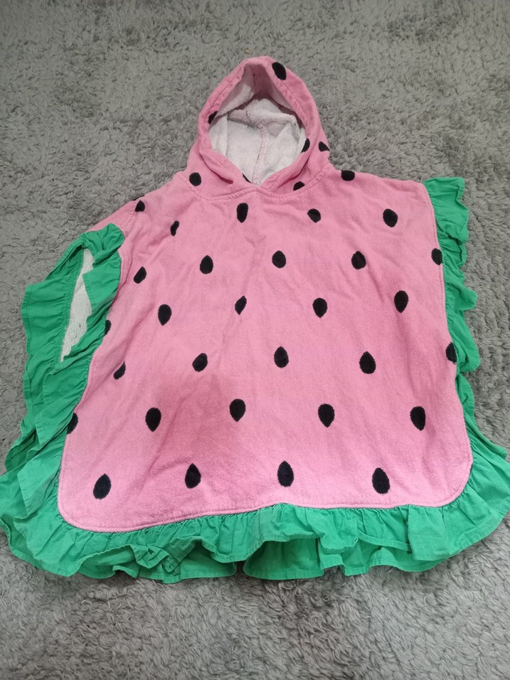 Renkli kız çocuk bornozu, yumuşak pembe kumaş üzerine siyah benekler ve yeşil fırfırlı kenarlarla kapüşonludur. Rahat ve havlu dokusundadır.