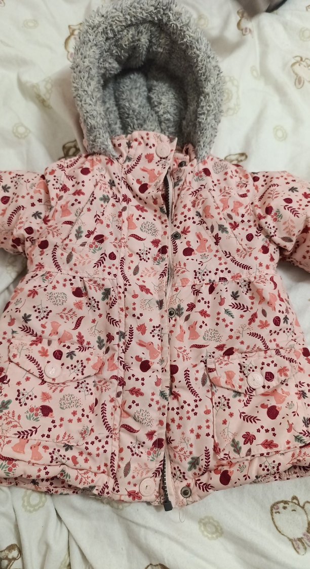 Pembe renkli, desenli ve kürklü detaylı bu mont, yumuşak fleece astarlıdır. Notch yakalı, trend sokak stili için uygundur.