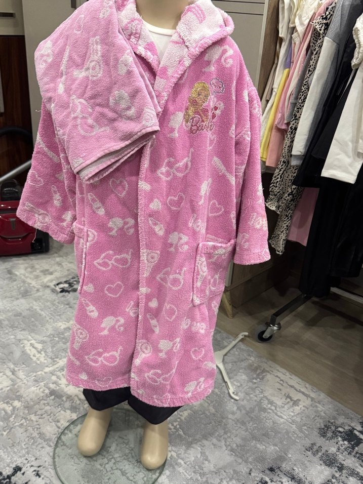 Kız Çocuk Pembe Desenli Polar Bornoz ve Havlu