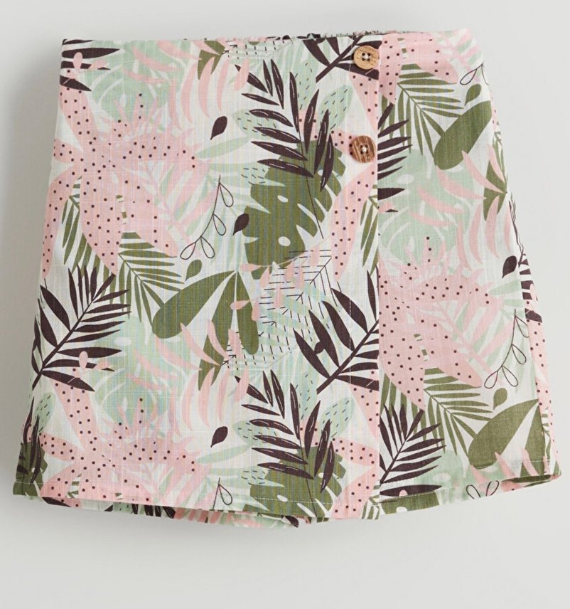 Pembe, yeşil ve kahverengi yaprak desenli, yumuşak sentetik kumaştan yapılmış kız çocukları için salaş kesim etek.