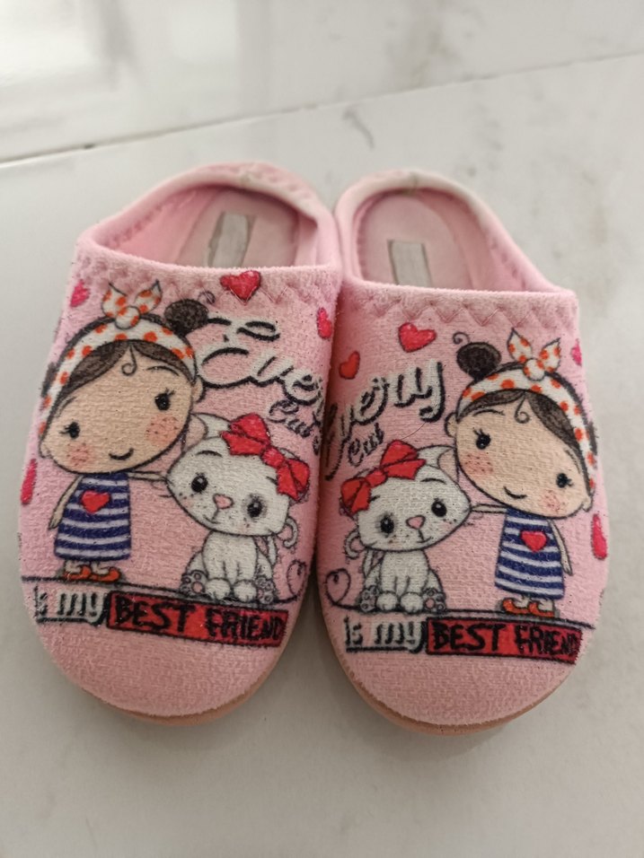 Yumuşak polar kumaştan, örme ve baskılı tasarımlı pembe kız çocuk sıcak ev terliği. Rahat sokak stili için uygundur.
