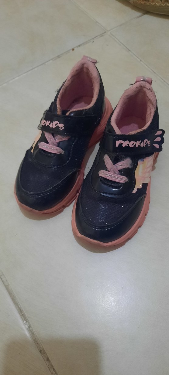 Kız çocukları için pembe renkli, desenli ve velcro bantlı spor ayakkabılar. Kauçuk tabanlı, sokak stiline uygun rahat tasarım. Üzerinde "PROKIDS" yazısı bulunur.