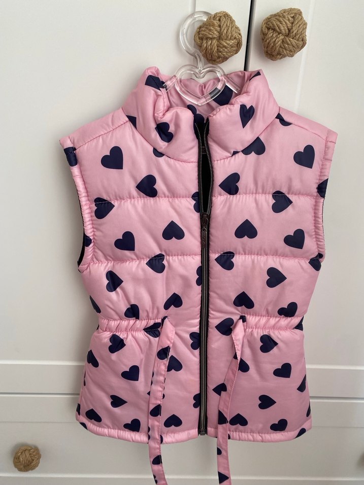 Yumuşak kumaştan yapılmış, düğmeli, yakalı ve kolsuz, pastel pembe kalp desenli kız çocuk yeleği. Trendy ve rahat bir tarza uygun.