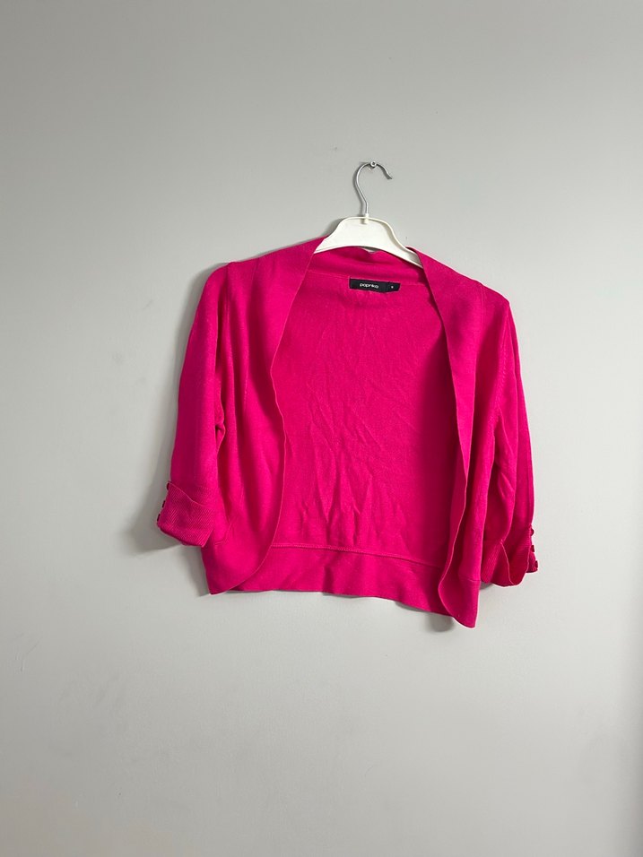 Kız çocukları için düğmeli ve yuvarlak yakalı bolero. Canlı pembe renkte, yumuşak ve sıcak dokulu kumaştan üretilmiştir.