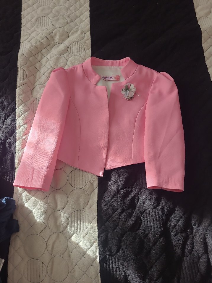 Pembe, düğmeli, yakalı ve uzun kollu kız çocuk bolero. Sade tasarımlı ve yumuşak sentetik kumaştan yapılmıştır.