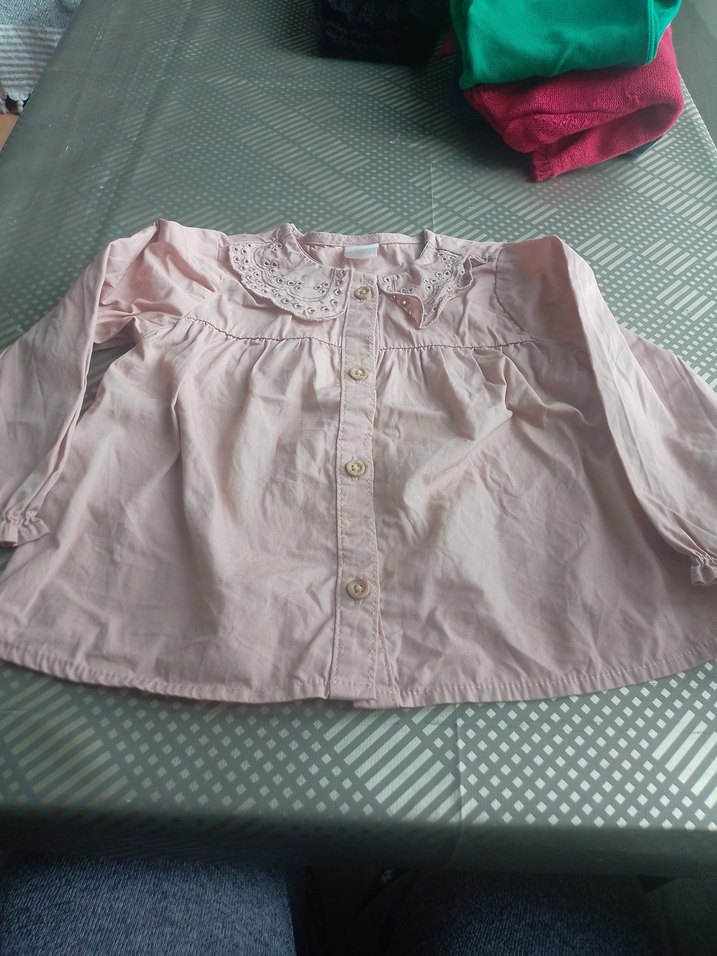 Uzun kollu, yakalı ve düğmeli önü olan pembe keten kız çocuk gömleği, rahat kesim ve pastel renk tonunda.
