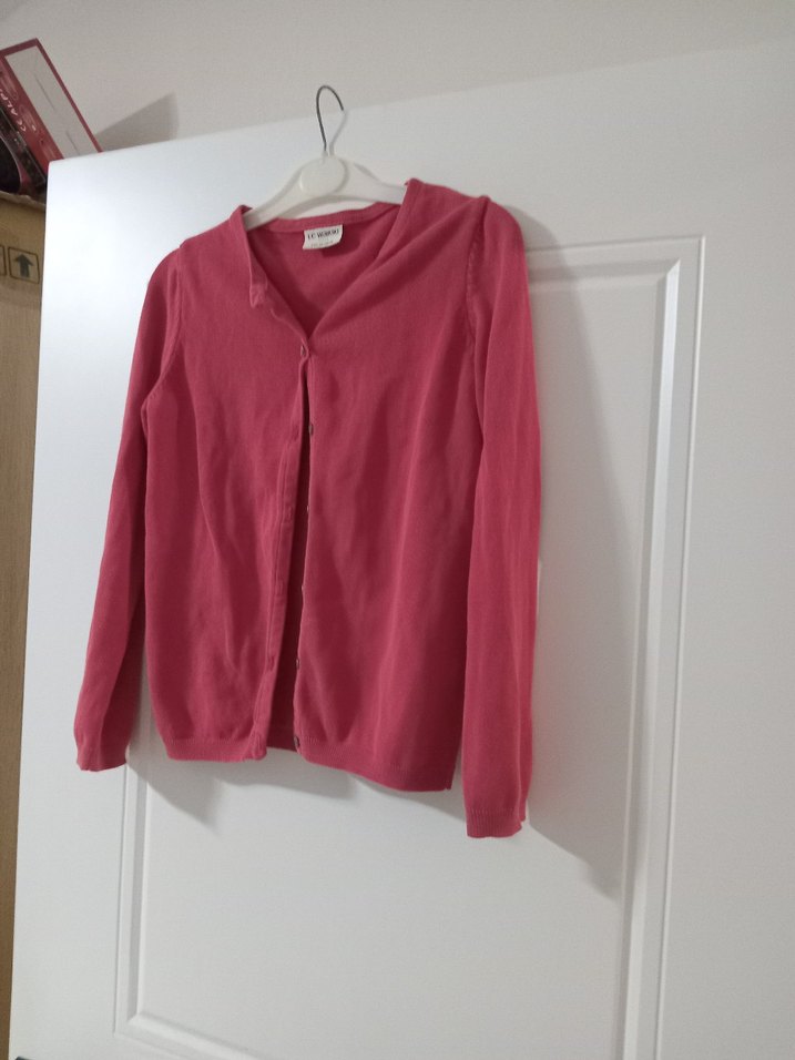 Kız çocukları için pastel pembe renkte, düğmeli, keten kumaştan yapılmış, uzun kollu ve bol kesim hırka. Desensiz ve sade tasarımlı.