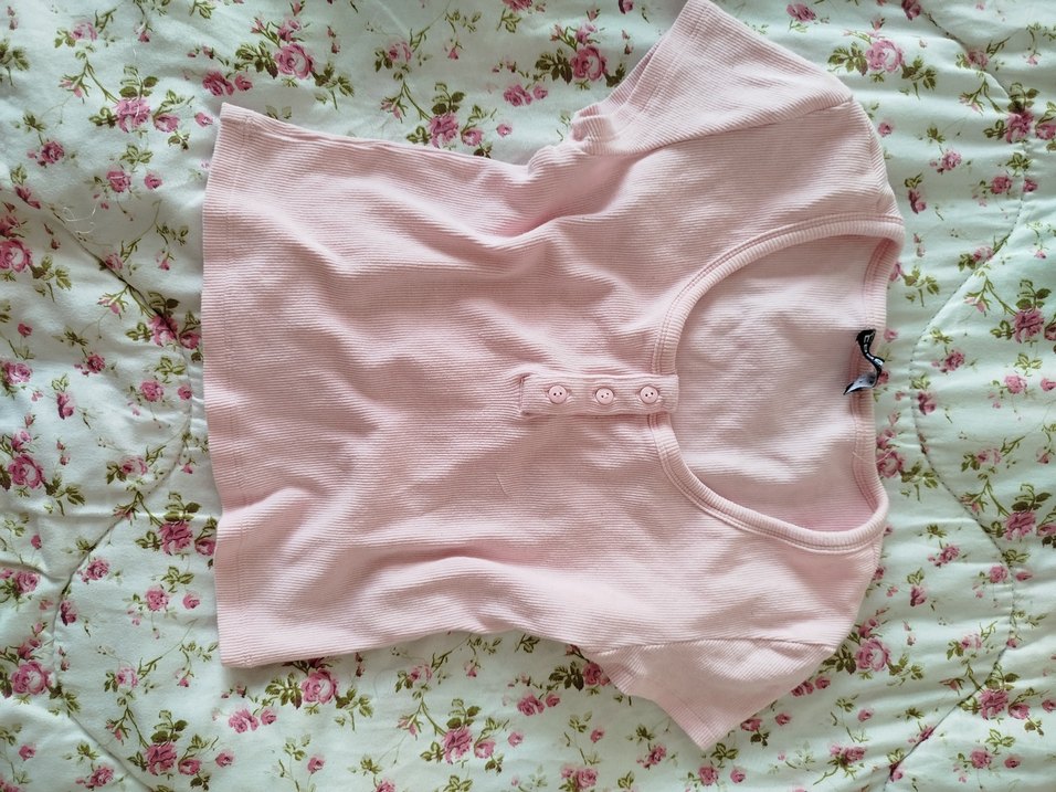 Kız çocukları için pastel pembe renkte, kısa kollu, yuvarlak yaka ve düğmeli detaylara sahip, pamuklu kumaştan yapılmış dar kesim tişört.