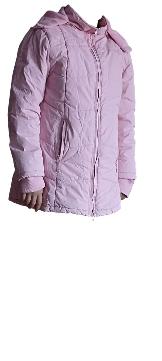Kız çocukları için pembe, düğmeli ve kesimli yakalı, yumuşak ve sıcak kumaştan yapılmış mont. Trend sokak giyimi için uygundur.