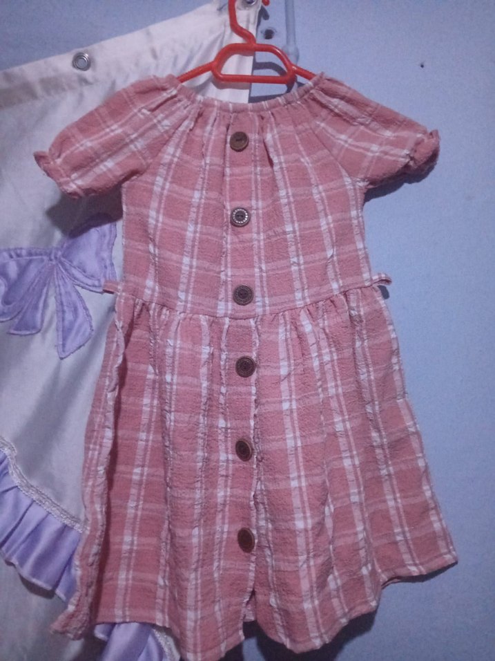 Pembe renkli, düğmeli ve kısa kollu kız çocuk elbisesi, pamuklu yumuşak kumaştan ve bol kesimdir. Pastel tonlarda bağlama deseni vardır. beline kuşak kurdele falan gerek bağlama icin 4 yasa da olur