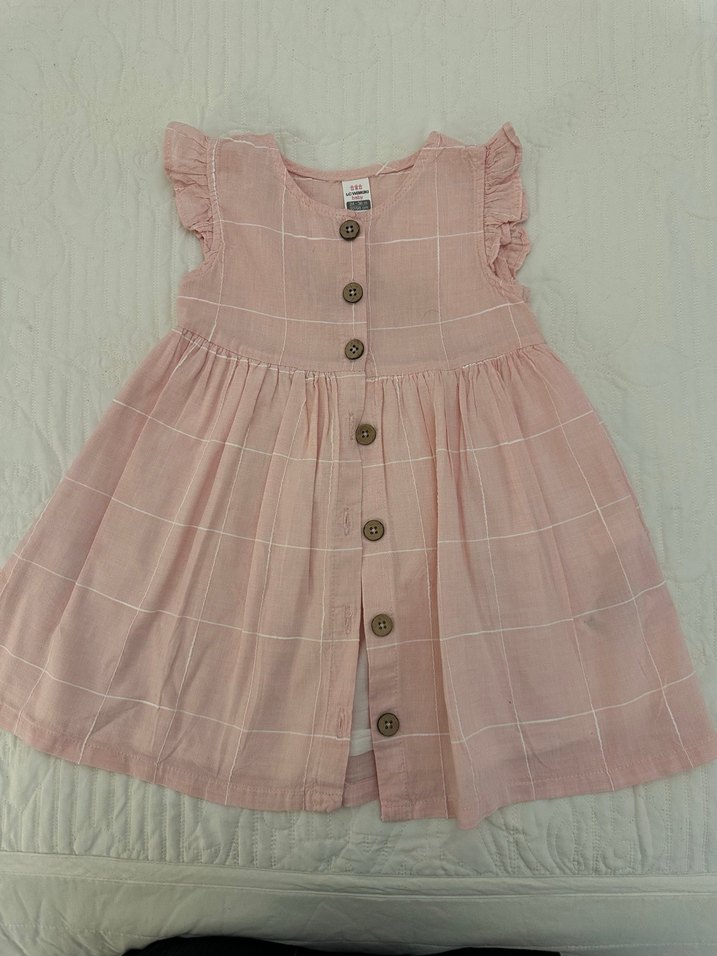 Düğmeli, kolsuz, pastel pembe kareli desene sahip pamuklu kız çocuk elbisesi. Rahat ve bol kesim bohem tarzda tasarlanmıştır.