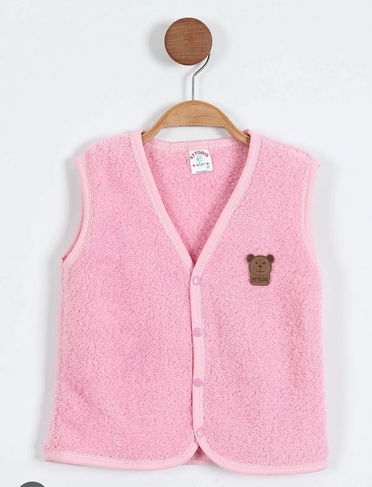 Düğmeli önü, V yaka ve nakış detaylı, bol kesim pembe, kolsuz yelek. Yumuşak ve sıcak kumaştan üretilmiştir.