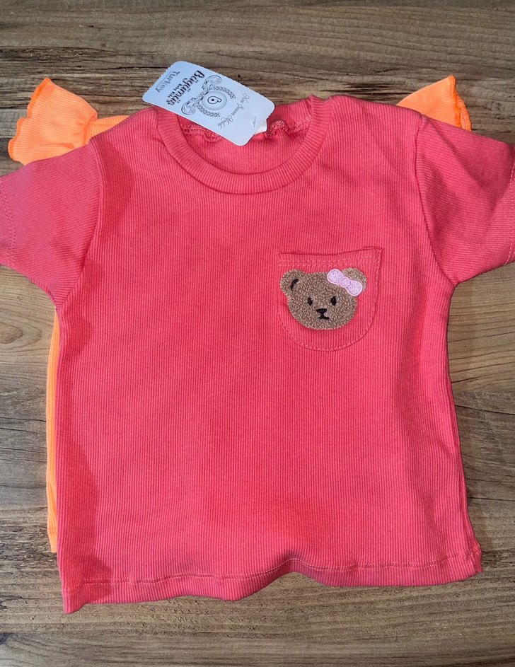 Kız çocuk tişörtü kısa kollu, yuvarlak yakalı ve bol kesimdir. Yumuşak ve sıcak kumaştan üretilmiş, renkli ayı baskılı cepli ve düğmeli detaylara sahiptir.