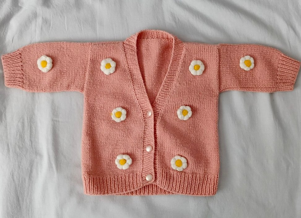 Pembe pastel renkli, uzun kollu ve düğmeli kız çocuk triko hırka. Önünde beyaz ve sarı çiçek detayları bulunur.