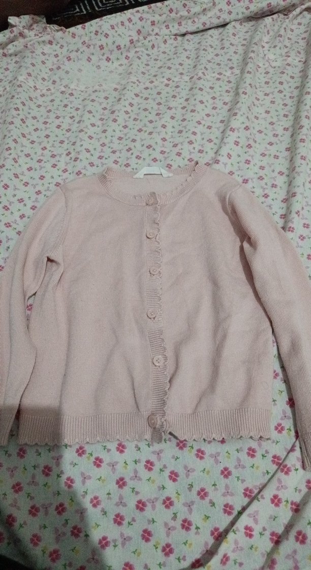 Pastel pembe renkte, uzun kollu ve düğmeli kız çocuk triko hırka. Salaş kesimi ve desensiz yapısıyla sade bir tarz sunar.