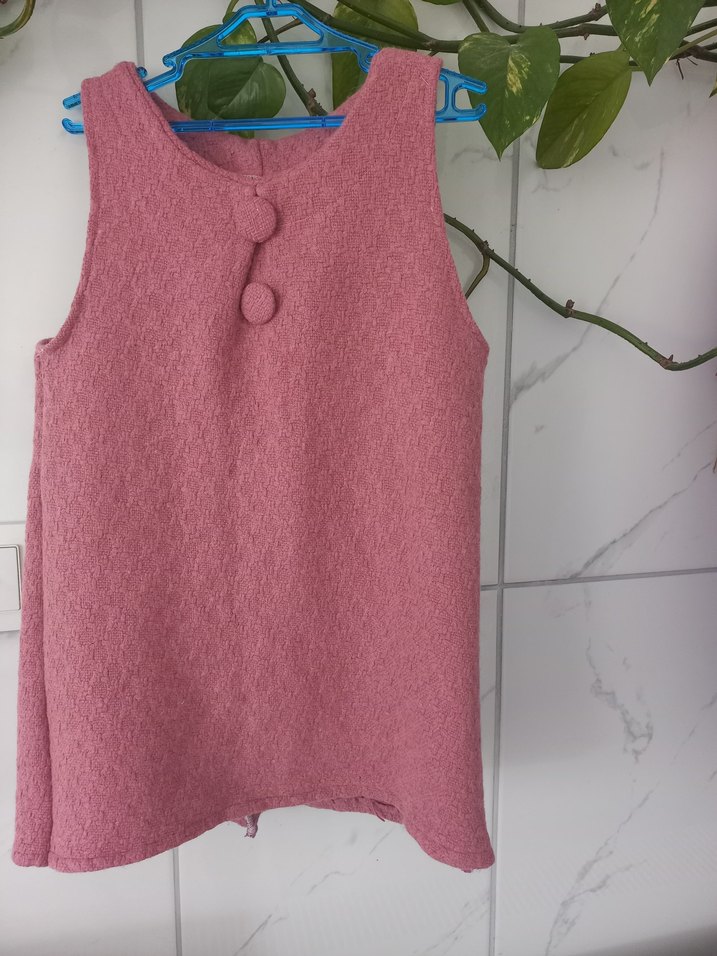 Düğmeli, bisiklet yaka, triko kumaştan yapılmış pembe renkli, kolsuz ve bol kesim kız çocuk yeleği. Pastel ve sade tarzda.